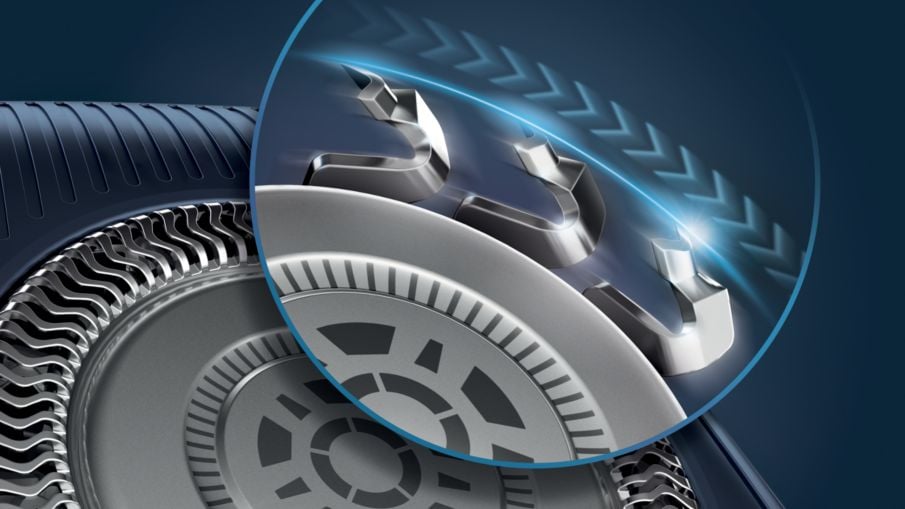 W pełni elastyczne głowice obracają się o 360°, aby podążać za konturem twarzy. Optymalny kontakt ze skórą zapewnia dokładne i wygodne golenie.