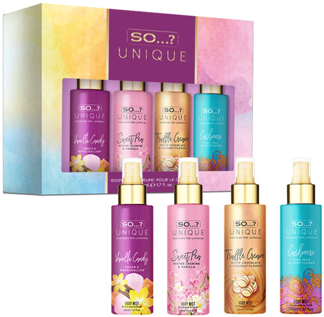 Zestaw mgiełek do ciała So...? Unique to znakomity wybór dla kobiet pragnących odkryć swoje wyjątkowe zapachy. W skład zestawu wchodzą cztery różnorodne aromaty, które umożliwiają stworzenie niepowtarzalnych kompozycji, idealnych na każdą okazję.