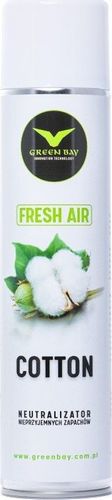 Green Bay Fresh Air Neutralizator nieprzyjemnych zapachów - Cotton AIR FRESH marki GREEN BAY to środek o podwójnym działaniu, odświeżacza powietrza i neutralizatora nieprzyjemnych zapachów. Silnie skoncentrowany aerozol doskonale nadaje się wszędzie tam, gdzie mamy do czynienia z większą powierzchnią użytkową, a której przeznaczenie przyczynia się do powstawania nieprzyjemnych zapachów (np. siłownie, przebieralnie.). Unikalna formuła i zwiększona pojemność, preparat jest bardzo wydajny, przez co wystarcza na dłużej niż tradycyjny środek tego typu, a zapach potrafi utrzymywać się do kilku dni. Działa błyskawicznie, w przeciągu kilku sekund skutecznie wiąże i neutralizuje wszelkie przykre zapachy z otoczenia. Jednocześnie odświeża i trwale wypełnia powietrze. Zalety produktu: - pojemność 600 ml/netto; - silnie skoncentrowany, jedno naciśnięcie wystarcza na 200/m3; - posiada specjalne substancje czynne do zwalczania zapachu; - długo utrzymuje się w powietrzu; - szybki i łatwy w użyciu dzięki specjalnemu wentylowi; - ekologiczny - substancje czynne nie zawierają metali ciężkich i składników szkodliwych dla warstwy ozonowe; - różne warianty zapachowe, Pojemność: 600ml