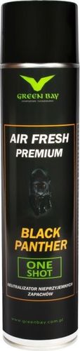 Green Bay Fresh Air Premium Neutralizator nieprzyjemnych zapachów - Black Panthere AIR FRESH marki GREEN BAY to środek o podwójnym działaniu, odświeżacza powietrza i neutralizatora nieprzyjemnych zapachów. Silnie skoncentrowany aerozol doskonale nadaje się wszędzie tam, gdzie mamy do czynienia z większą powierzchnią użytkową, a której przeznaczenie przyczynia się do powstawania nieprzyjemnych zapachów (np. siłownie, przebieralnie.). Unikalna formuła i zwiększona pojemność, preparat jest bardzo wydajny, przez co wystarcza na dłużej niż tradycyjny środek tego typu, a zapach potrafi utrzymywać się do kilku dni. Działa błyskawicznie, w przeciągu kilku sekund skutecznie wiąże i neutralizuje wszelkie przykre zapachy z otoczenia. Jednocześnie odświeża i trwale wypełnia powietrze. Zalety produktu: - pojemność 600 ml/netto; - silnie skoncentrowany, jedno naciśnięcie wystarcza na 200/m3; - posiada specjalne substancje czynne do zwalczania zapachu; - długo utrzymuje się w powietrzu; - szybki i łatwy w użyciu dzięki specjalnemu wentylowi; - ekologiczny - substancje czynne nie zawierają metali ciężkich i składników szkodliwych dla warstwy ozonowe; - różne warianty zapachowe, Pojemność: 600ml