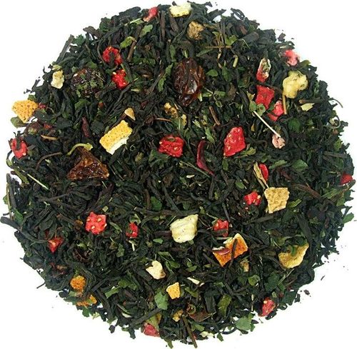 Sencha China, melisa, hibiskus, pomarańcza, cytryna, skórka róży, jabłko, truskawka, aromat