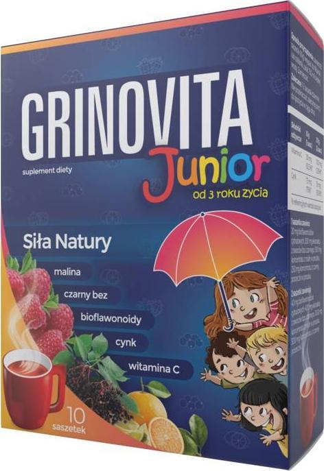 Grinovita Junior zalecana jesienią, zimą i wczesną wiosną dla dzieci od 3. roku życia. Grinovita Junior zawiera w przeliczeniu na jedną saszetkę 62,5% dziennej dawki witaminy C i 75% dziennej dawki cynku, wyciąg z owoców czarnego bzu, koncentraty soków z malin i czarnej porzeczki, co sprawia, że Grinovita Junior stanowi cenne uzupełnienie diety dziecka. Maliny i czarna porzeczka są źródłem witaminy C. Owoce czarnego bzu zawierają barwniki, aminokwasy, cukry, rutynę oraz witaminę C. Witamina C i cynk pomagają w prawidłowym funkcjonowaniu układu odpornościowego. Bioflawonoidy cytrusowe są antyoksydantami.