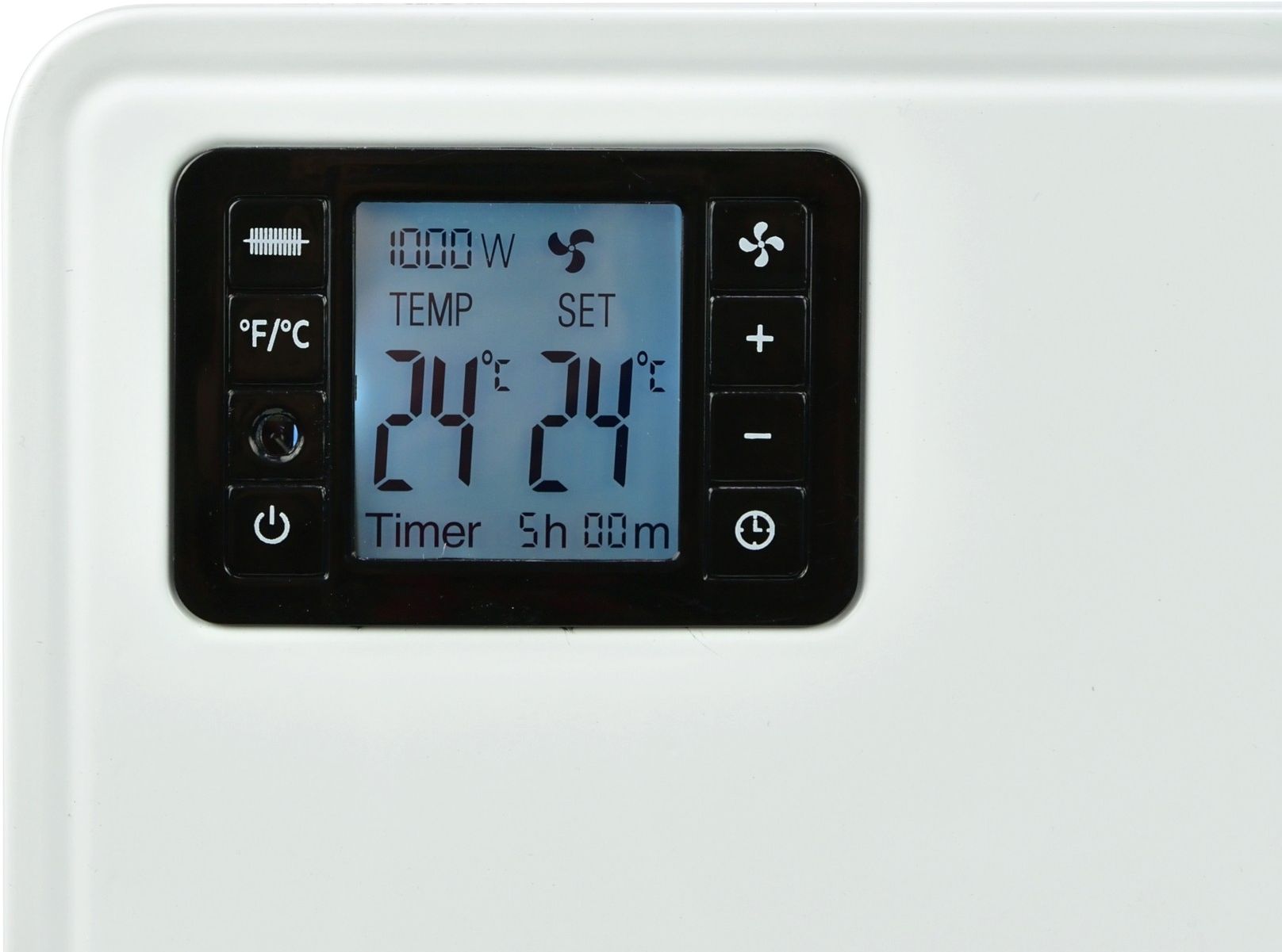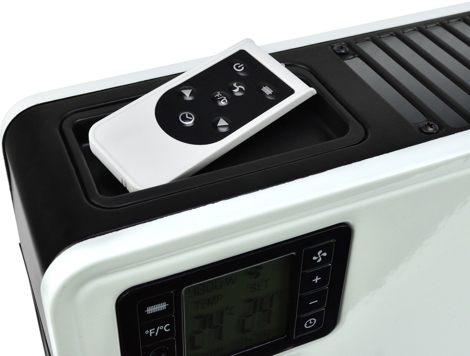 Grzejnik konwektorowy z wyświetlaczem LCD z pilotem sterowania, wolnostojący z możliwością zawieszenia na ścianie. 3 poziomy mocy: 1000W / 1300W / 2300W + funkcja Anti-Frost. Wyłącznik bezpieczeństwa, bezpiecznik zabezpieczający przed przegrzaniem, system przeciwzamrożeniowy (anti-frost), automatyczne wyłączanie po przewróceniu. Funkcja turbo – wbudowany wentylator skracający czas potrzebny do ogrzania pomieszczenia. Jego moc 2300 W pozwoli na ogrzanie pomieszczeń małych, po średnie a nawet większe. Duża moc sprawia, że grzejnik nagrzewa się w zaskakującym tempie. Poręczny i lekki grzejnik konwektorowy idealnie sprawdzi się w małych lub średnich pomieszczeniach. Bardzo szybko nagrzewa pomieszczenie