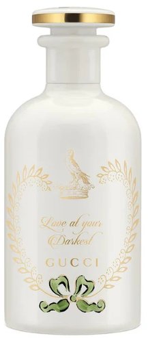 Stworzony w wyniku współpracy Dyrektora Kreatywnego Gucci, Alessandro Michele, i mistrza perfumiarstwa Alberto Morillasa, Gucci Beauty prezentuje zapach o tajemniczej nazwie Love at your Darkest. Miłość przenika mrok niczym jastrząb przebijający niebo, dzięki głębokiemu, drzewnemu i korzennemu aromatowi perfum, który łączy w sobie czarny pieprz, olibanum i cedr. Pikantność czarnego pieprzu, stanowiąca nutę głowy, nadaje zapachowi wyrazistą energię, a jego zmysłowe bogactwo rozwija się dzięki balsamicznej słodyczy olibanum. Całość dopełnia królewski cedr, który symbolizuje siłę, determinację i odwagę, zachęcając do odkrywania najciemniejszych zakątków miłości. Flakon perfum ozdobiony złotym wzorem liści, z zieloną kokardą na dole, emanuje elegancją.
