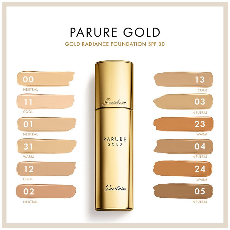 Marka Guerlain, zainspirowana złotem – symbolem piękna i wieczności, tworzy Parure Gold. Podkłady z gamy Parure Gold mają niezwykle zmysłowe konsystencje i zapewniają skórze promienne wykończenie. Sublimują urodę kobiet i ukazują promienną cerę, która zyskuje bardziej młodzieńczy wygląd. Czerpiąc natchnienie ze złota, Guerlain prezentuje podkład Parure Gold w nowej odsłonie: jego formuła nadaje skórze blask.