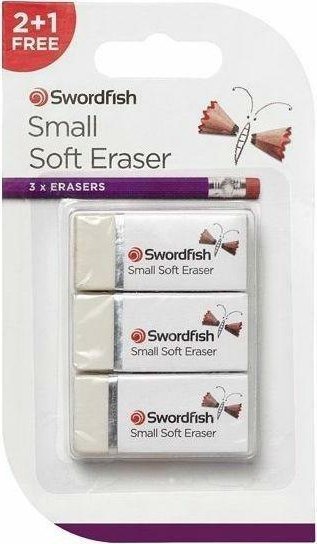 Trzy małe, miękkie gumki marki Swordfish, wykonane z tworzywa sztucznego, każda w osłonce chroniącej przed zabudzeniem. Usuwają rysunek delikatnie, nie naruszając papieru.