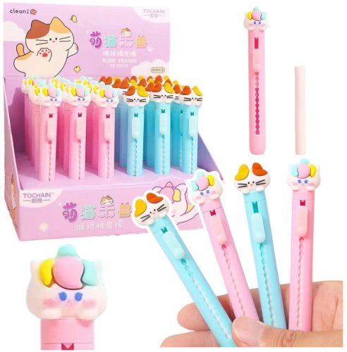 Wysuwana gumka do mazania z uroczą figurką kotka to praktyczny i estetyczny dodatek do szkolnego zestawu każdego dziecka. Pastelowe kolory, zabawna forma i miękka gumka zatopiona w piasku sprawiają, że produkt jest nie tylko funkcjonalny, ale i atrakcyjny wizualnie. Ergonomiczna obudowa umożliwia łatwe wysuwanie gumki za pomocą suwaka i chroni ją przed zabrudzeniem.