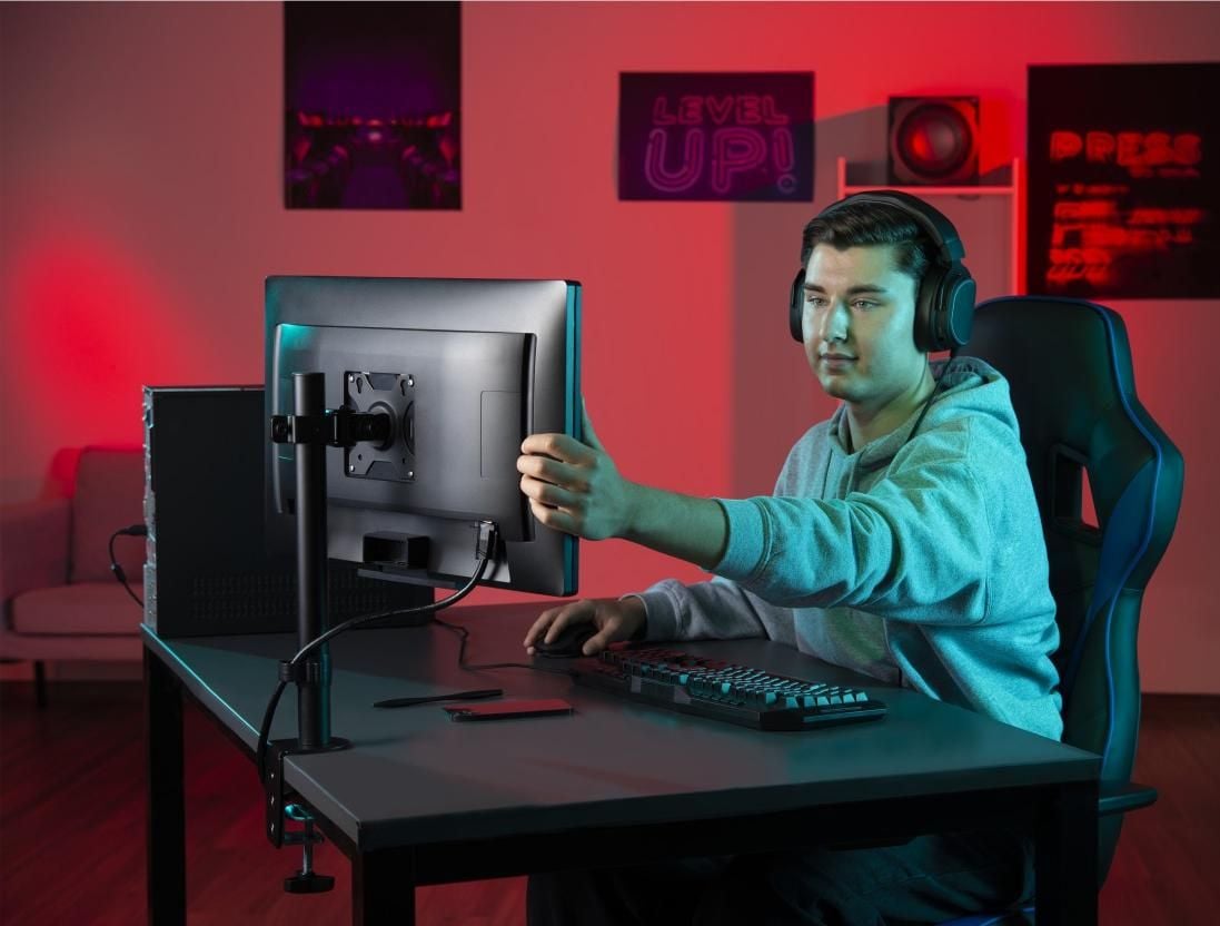 Ten uchwyt na monitor dopasowuje się do indywidualnych potrzeb i postawy podczas siedzenia – możliwość bezstopniowej regulacji wysokości, obracania, przechylania i ustawiania w orientacji pionowej lub poziomej zapewnia ergonomię w biurze i w domu.