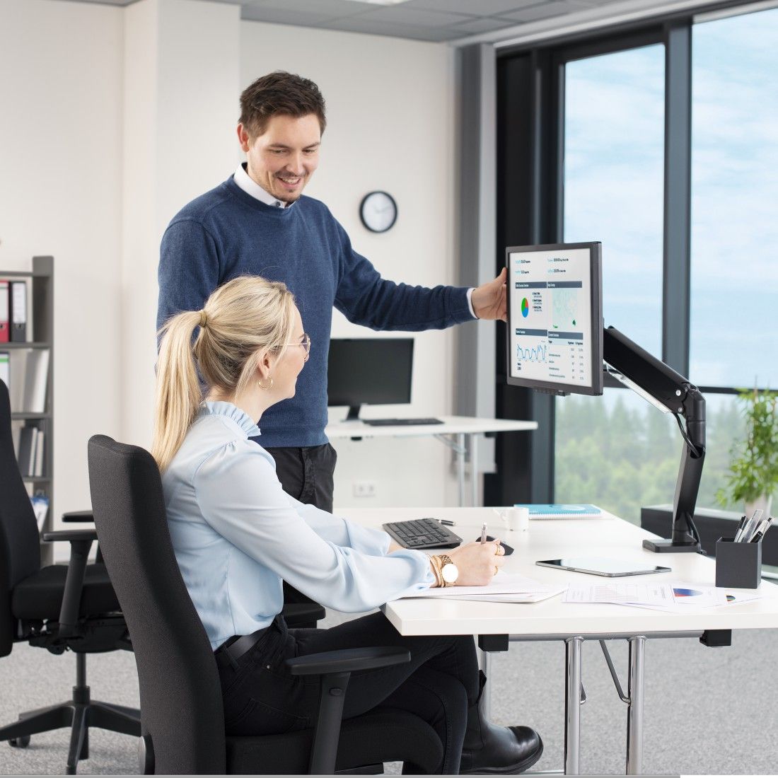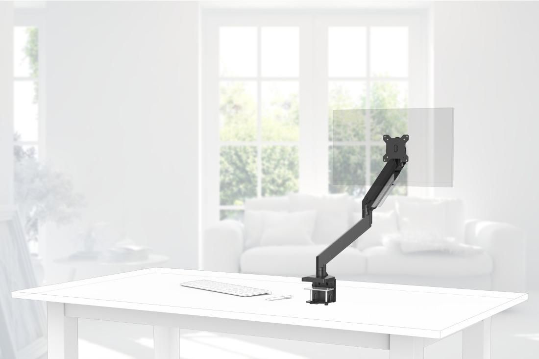 Dzięki wysoce wydajnej sprężynie gazowej dopasowywanie wysokości każdego monitora, nawet tych najcięższych, jest dziecinnie proste – idealne rozwiązanie dla współdzielonych biurek.