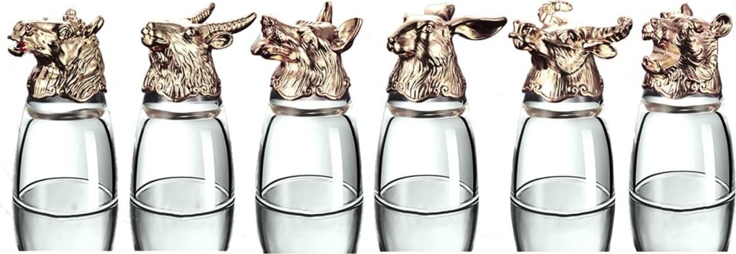 Męski, klasyczny komplet do alkoholu. Sześć szklanych kieliszków o prostej formie, zwieńczonych motywem głów zwierząt.