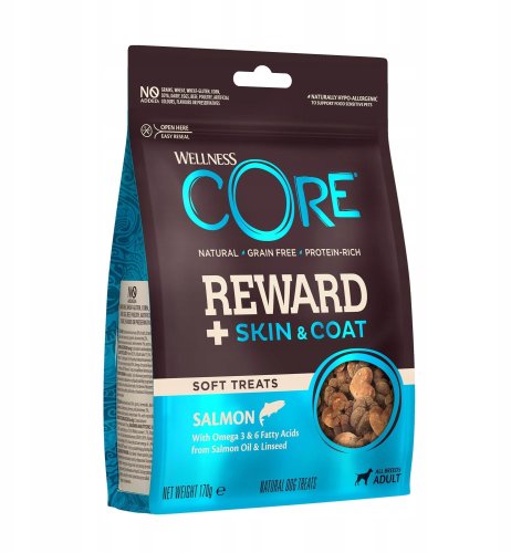 Wellness CORE Reward+ Skin and Coat* to wyjątkowe przysmaki stworzone z myślą o dorosłych psach, które potrzebują wsparcia w utrzymaniu zdrowej skóry i sierści. Oparte na wysokiej jakości łososiu, te smakołyki dostarczają niezbędnych składników odżywczych, wpływających na kondycję sierści oraz zdrowie skóry Twojego pupila.