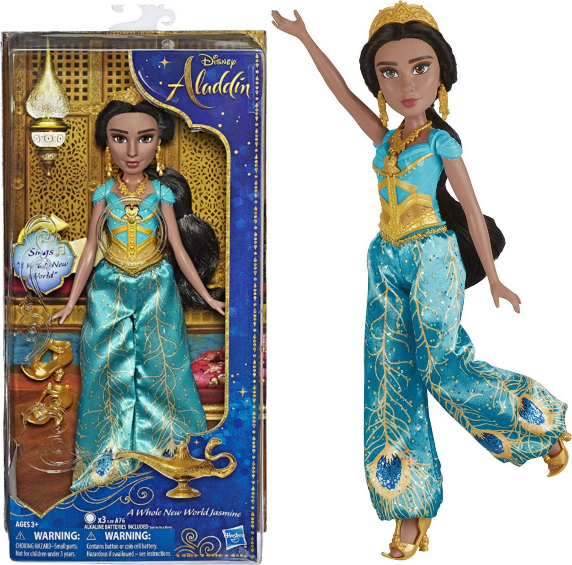 Lalka wiernie odwzorowuje Jasmine z filmowego musicalu "Alladyn". Księżniczka ma piękne długie włosy i duże ciemne oczy. Ubrana jest w bogato zdobiony strój ozdobiony brokatem i wzorem pawich piór. Cały strój dopełniony jest złotymi dodatkami jak diadem, kolczyki i buty. Jasmine posiada na bluzce złoty przycisk, który po naciśnięciu sprawi, że lalka zacznie śpiewać piosenkę z filmu. |