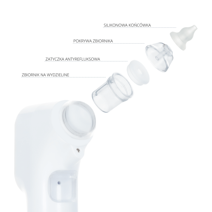 Łatwy montaż i demontaż sprawia, że urządzenie jest gotowe do pracy w kilka sekund. Nie wymaga zaangażowania oddechu opiekuna, co minimalizuje ryzyko przenoszenia zarazków. Aspirator jest lekki i dopasowany do dłoni, dzięki temu nie obciąża nadgarstka. Ergonomiczny kształt zapewnia pewny chwyt podczas procesu odciągania kataru. Gdy wydzielina jest zbyt gęsta, wystarczy rozcieńczyć ją woda morska lub solą fizjologiczną.