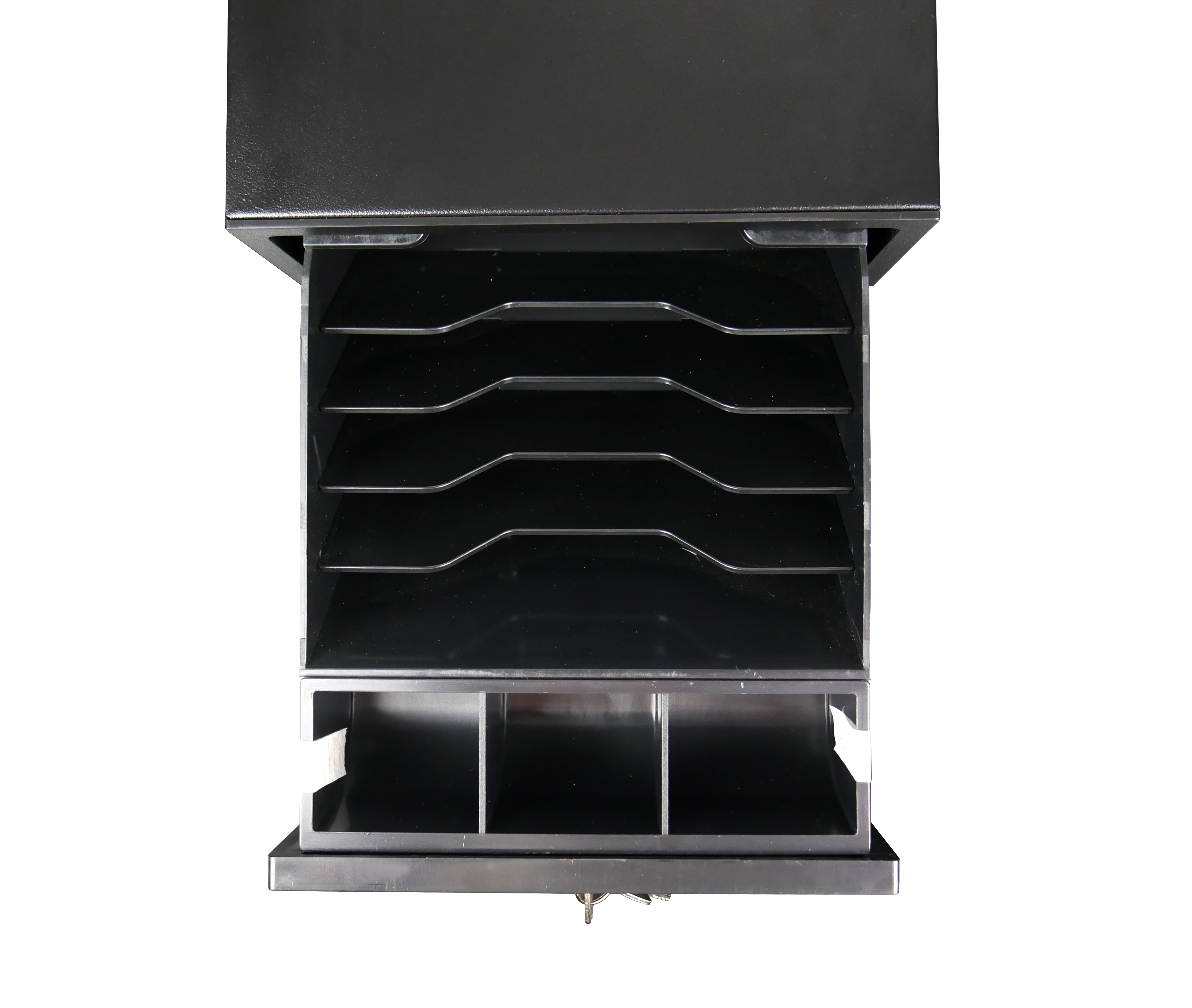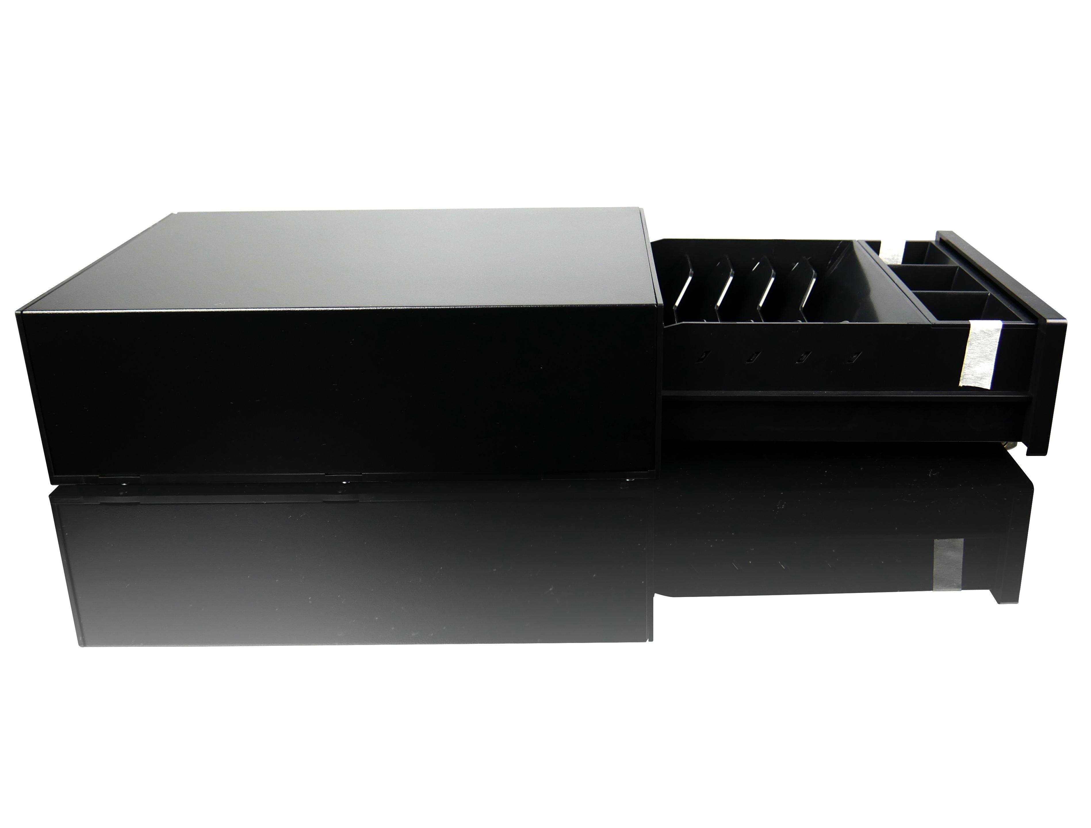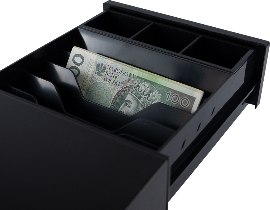 W celu utrzymania porządku i zapewnienia wygody urządzenie zostało wyposażone w 5 przegród na banknoty i 3 przegrody przeznaczone na monety. Pozostałe środki płatnicze jak bony, talony, czeki czy potwierdzenia płatności można przechowywać pod wyjmowanym organizerem na monety, co dodatkowo ułatwiaotwór o szerokości 16 cm, eliminując konieczność otwierania szuflady.