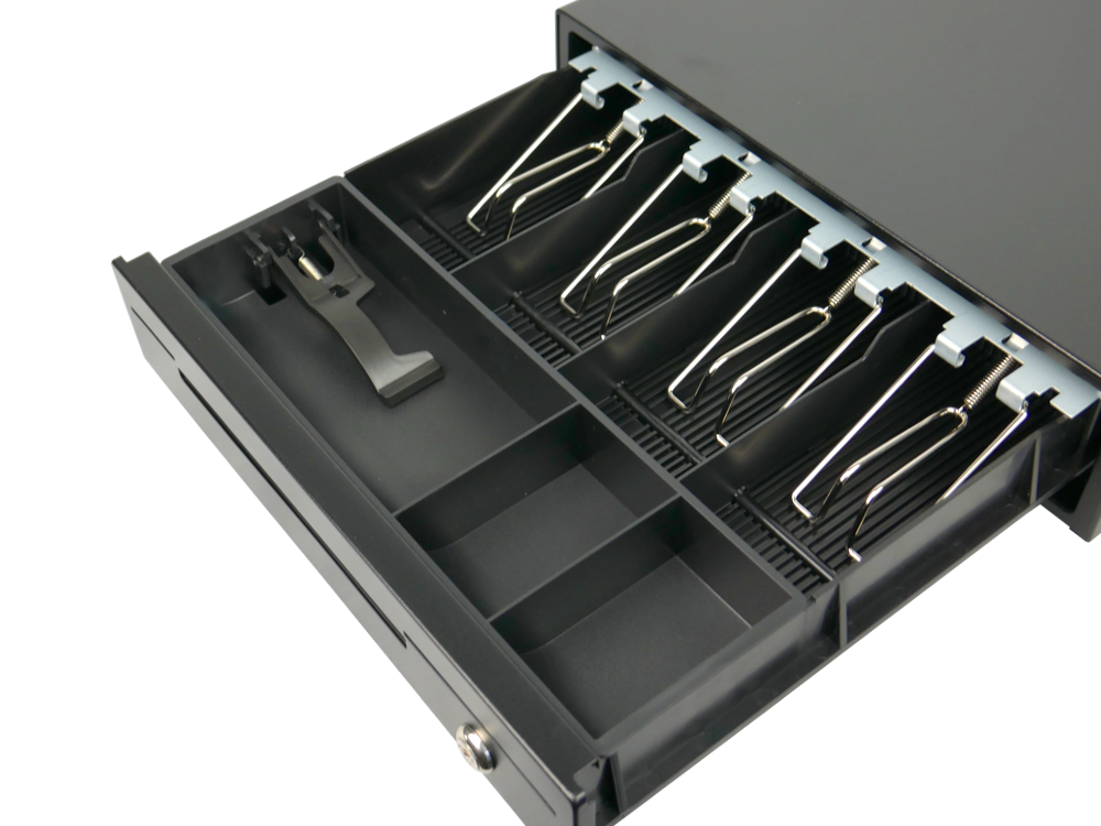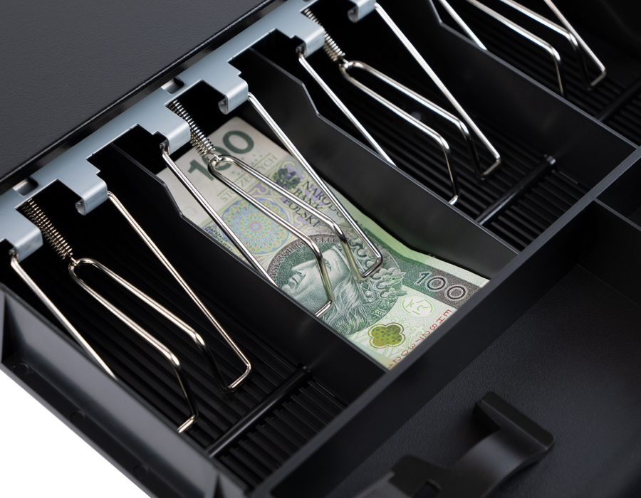 W zachowaniu porządku przechowywanych środków pieniężnych pomaga praktyczny organizer wyposażony w pięć przegród na banknoty ze sprężynowymi zatrzaskami oraz dwie przegrody na monety, które mogą zostać całkowicie zdemontowane wraz z jedną przegrodą na banknoty. Na froncie szuflady została umiejscowiona specjalna, szeroka szczelina, pozwalająca na schowanie pozostałych środków płatniczych, jak bony, czeki, talony bez konieczności otwierania szuflady, co wpływa na wygodę pracy.