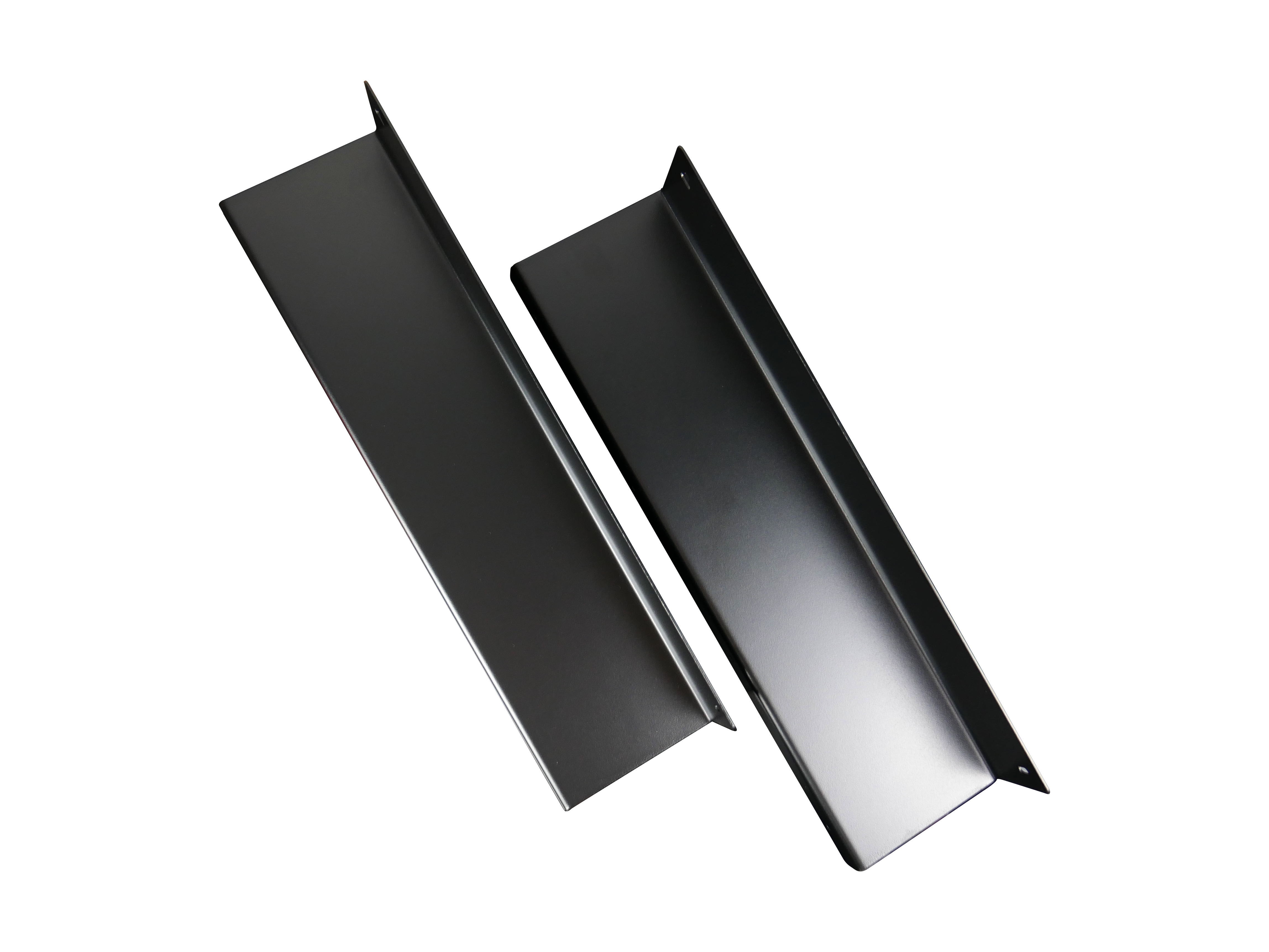 Dwa czarne uchwyty mocujące z grubej stali, śruby mocujące uchwyt do blatu.