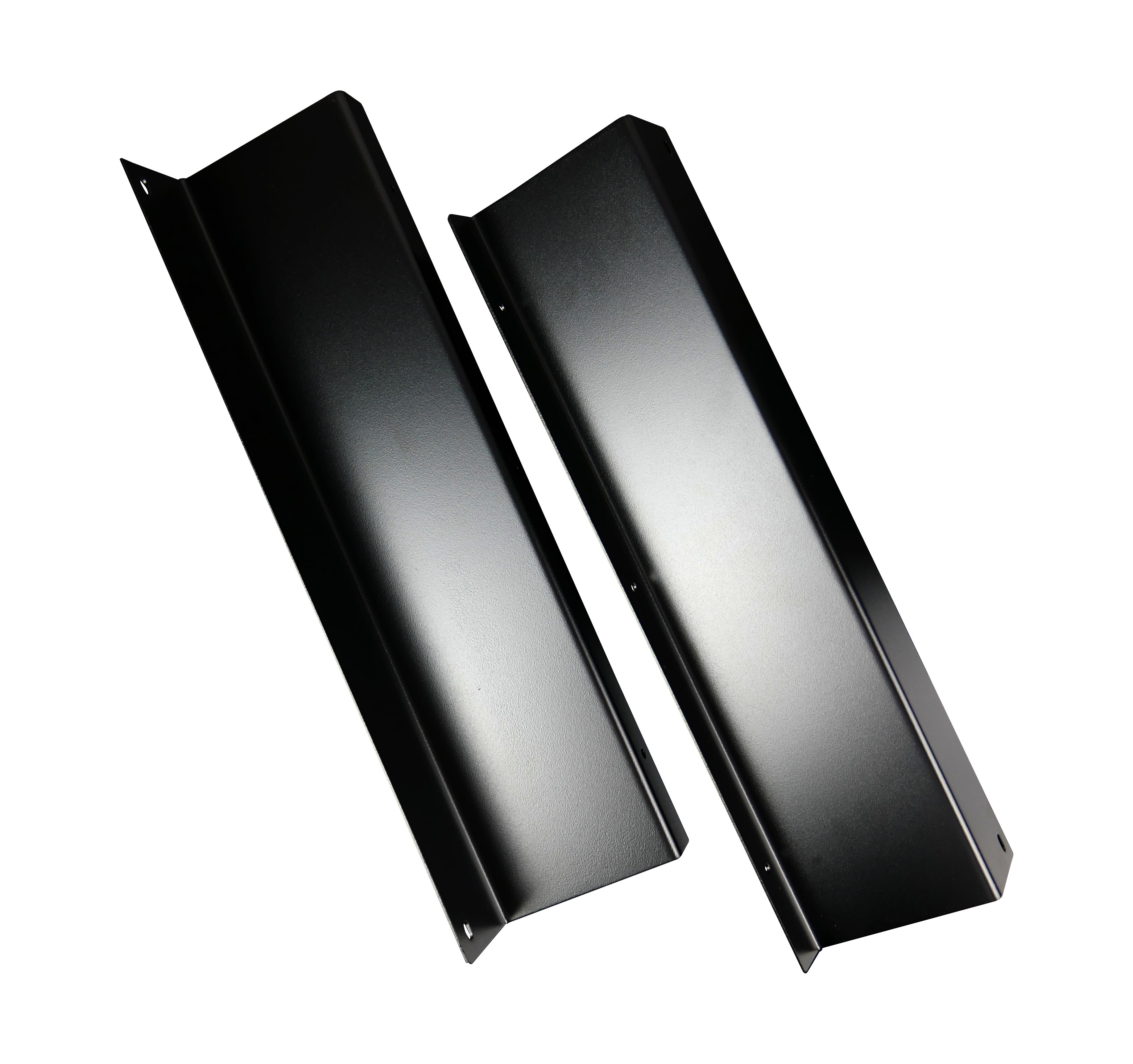 Dwa czarne uchwyty mocujące z grubej stali, śruby mocujące uchwyt do blatu.
