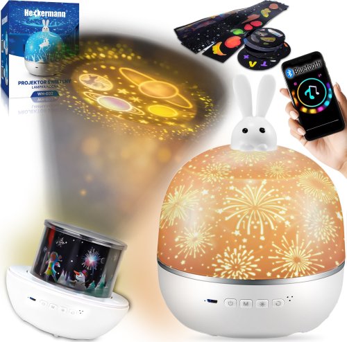 Projektor Heckermann WH-E02 Królik to nie tylko projektor gwiazd, ale także lampka nocna z funkcją Bluetooth. Dzięki tej technologii, użytkownicy mogą odtwarzać swoje ulubione melodie, co dodatkowo zwiększa komfort użytkowania i pozwala na stworzenie relaksującej atmosfery w pokoju dziecka.