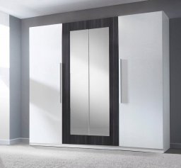 Pojemna i stylowa szafa do klasycznych i modernistycznych wnętrz. Ciekawie zaprojektowana szafa idealnie sprawdzi się w każdej sypialni. Szafa wewnątrz podzielona jest na dwie funkcjonalne części. W jednej części znajduje się drążek na wieszaki, a w drugiej liczne półki. Dzięki temu szafa jest bardzo praktyczna i pozwoli uporządkować całą garderobę. Na środku umieszczone jest duże lustro, które oprócz możliwości przejrzenia się, sprawi także, że wnętrze optycznie się powiększy. Dwa podłużne i minimalistyczne uchwyty zapewniają wygodne otwierane, a dodatkowo zapewnią efektowny i estetyczny wygląd.