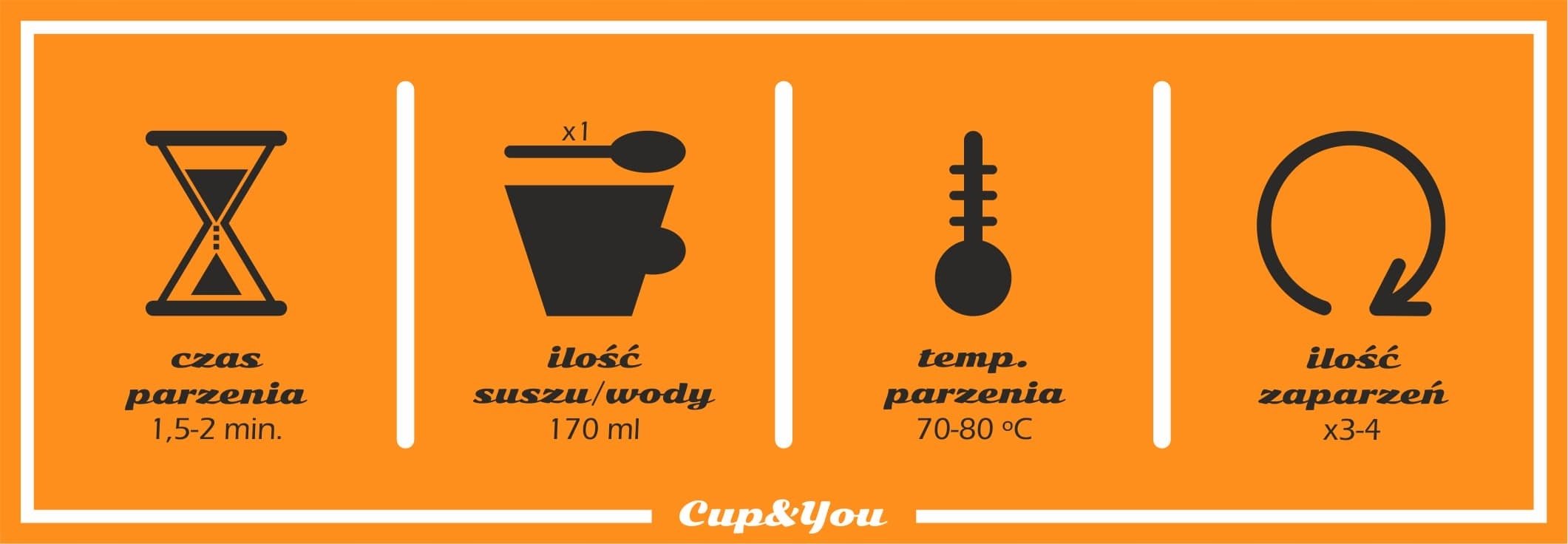 Parzymy wodą o temperaturze 70°-80° C, 1,5-2 minuty (w zależności od upodobań związanych z intensywnością naparu), 1 łyżeczka suszu na 170ml wody (mała filiżanka), można parzyć 3-4 razy.