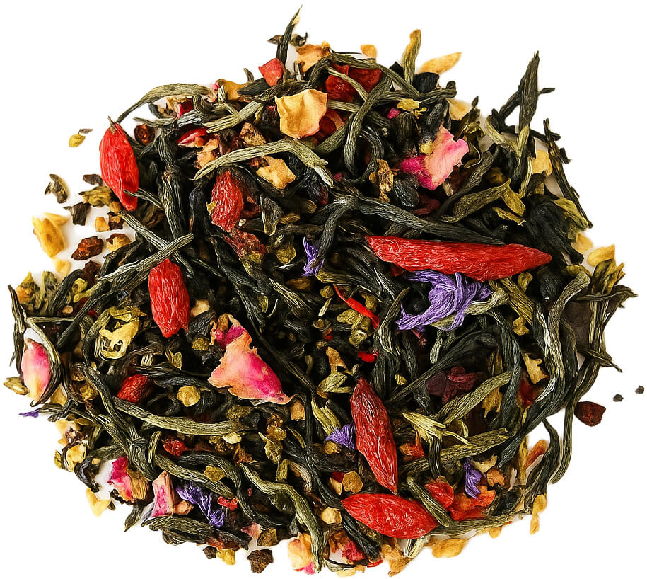 Subtelna biała herbata w orientalnym wydaniu – soczyste owoce goji łączą się z delikatną nutą malin, tworząc harmonijną i lekko słodką kompozycję. Dodatek kwiatów, rodzynek i skórki curacao wzbogaca smak, nadając mu eleganckiego, egzotycznego charakteru.