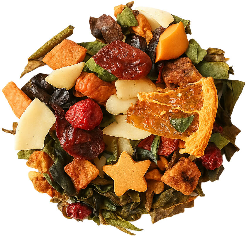 Ta wyjątkowa kompozycja łączy delikatność białej herbaty z orzeźwiającym duetem pomarańczy i limonki. Słodycz ananasa, banana i winogron harmonijnie przeplata się z egzotycznym mango, papają i nutą kokosa, a całość dopełniają kwaskowe akcenty czerwonej porzeczki i żurawiny. Złote gwiazdki i płatki róży dodają jej elegancji, sprawiając, że każdy łyk jest małym, pełnym smaku rytuałem.