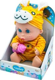 Lalka - mały bobas, który ma 24 cm. Ubrany jest w kombinezon i czapeczkę. Całe ubranko jest dwukolorowe i ma nadruk tygrysa na bluzce. Czapka ma doszyte uszy i nosek zwierzątka. Lalka posiada wyszczególnione źrenice oraz piegi. Bobas ma bardzo dobrze odwzorowane buzie i ciało do rzeczywistego wyglądu. Trzyma w ręce butelkę. Wymiary opakowania: 13x18,5x11,5cm Wiek: 3+
