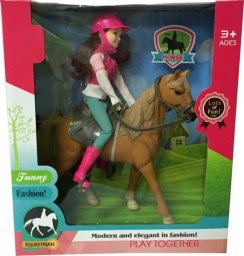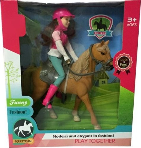 Lalka w zestawie z dużym koniem. Koń jest brązowy z odwzorowaną fakturą sierści. Posiada jasną brązową grzywę i ogon. Na grzbiecie ma szare siodło dla lalki, a na pysku ogłowie z lejcami. Lalka posiada długie włosy oraz na buzi lekki makijaż. Ubrana jest w bluzkę z długim rękawem, spodnie, kozaki i kask. Idealny zestaw dla dziewczynek intersujących się końmi. Wymiary opakowania: 34x26,5x8,5cm Wiek: 3+