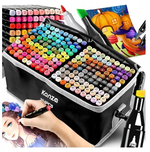 W skład zestawu wchodzi 204 markery alkoholowe dwustronne, które są starannie zapakowane w elegancką torbę z zamkiem. Taki sposób przechowywania nie tylko zapewnia porządek, ale również dodaje stylu. Dzięki temu zestawowi, każdy artysta ma wszystko, co potrzebne do twórczej pracy w jednym miejscu.
