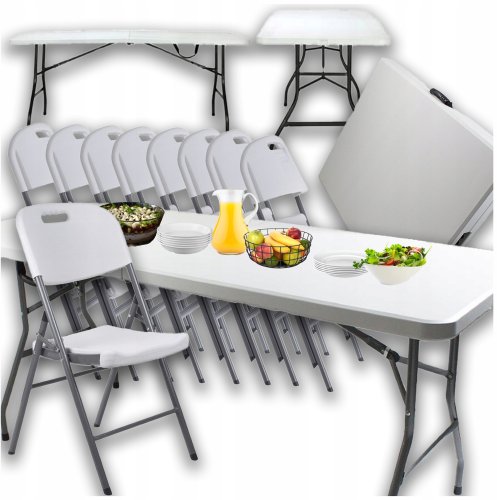W zestawie znajduje się stół cateringowy KANZA oraz 8 składanych krzeseł, co czyni go kompletnym rozwiązaniem do organizacji różnorodnych wydarzeń.
