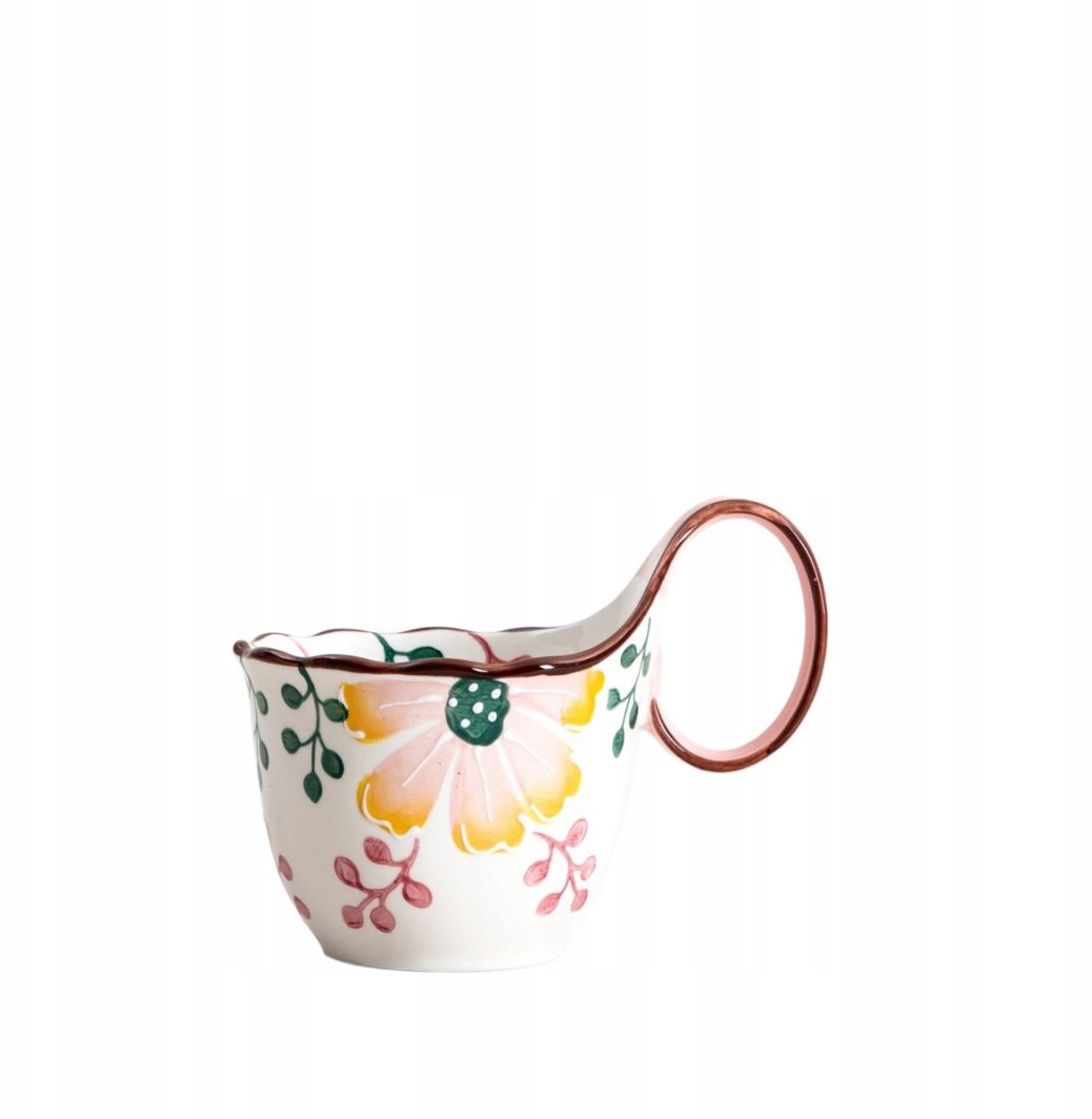 Kubek Homla Noya o pojemności 0,4 l, wyposażony w duże ucho, to eleganckie naczynie, które harmonijnie łączy funkcjonalność z estetyką. Jego artystyczny wzór oraz delikatnie zaokrąglona forma sprawiają, że stanowi doskonały element dekoracyjny w każdym wnętrzu. Subtelne motywy roślinne w ciepłych odcieniach przyciągają wzrok i nadają charakteru każdemu stołowi.