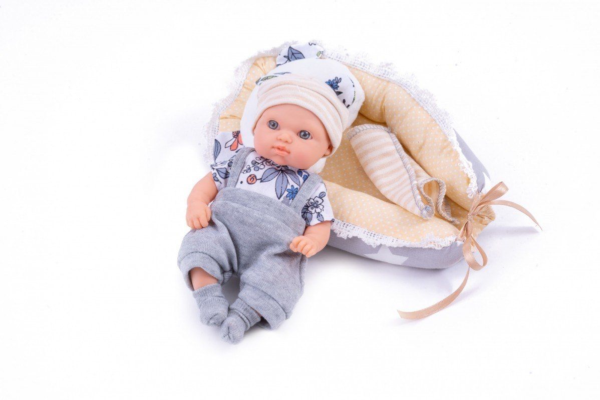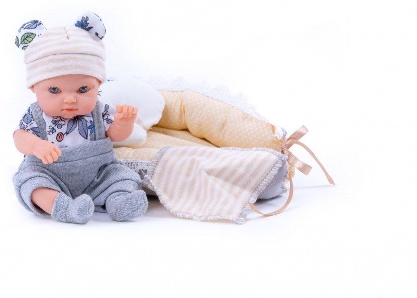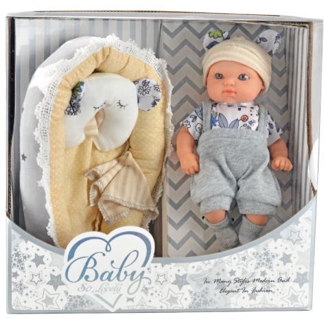 Prześliczna gumowa lalka z ubrankami zachwyci każdą dziewczynkę Ta urocza lalka niemowlę posiada pięknie uszyty strój, którego szary odcień i kolorowe detale sprawi, że Twój maluch nie będzie chciał rozstać się z tą zabawką. W zestawie znajduje się również materac dla lalki, w kształcie małej gondoli.