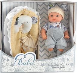 Prześliczna gumowa lalka z ubrankami zachwyci każdą dziewczynkę Ta urocza lalka niemowlę posiada pięknie uszyty strój, którego szary odcień i kolorowe detale sprawi, że Twój maluch nie będzie chciał rozstać się z tą zabawką. W zestawie znajduje się również materac dla lalki, w kształcie małej gondoli.