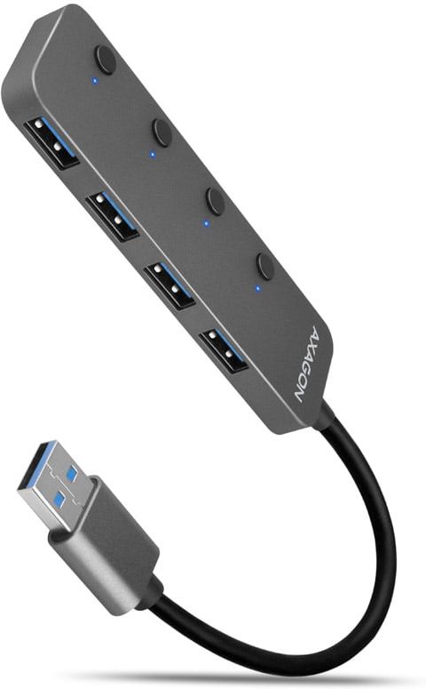 Zewnętrzny AXAGON HUE-MSA to koncentrator USB z czterema portami USB 3.0, które można włączać i wyłączać indywidualnie. Można do niego podłączyć urządzenia korzystające z wysokiej prędkości do 5 Gb/s.