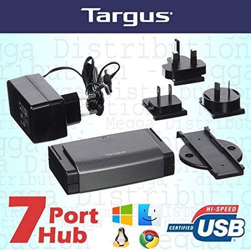 Targus 2-w-1 przenośny szybki hub USB 2.0 z 7 portami, z międzynarodowym zasilaczem 5 V, uniwersalny dla Windows / Mac / Linux / Chrome, łatwa instalacja plug-n-play