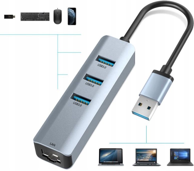 Karta sieciowa umożliwia przejście z standardowego gniazda USB 3.0/2.0 do gniazda Ethernet RJ-45. Adapter wspiera wszystkie najnowsze technologie umożliwiające najszybszą prędkość przesyłu danych (Gigabit Ethernet), dzięki czemu możesz przesyłać dane z prędkością do 1000 Mbps. Nasza przejściówka pełni dodatkowo rolę huba USB 3.0, dzięki czemu jesteś w stanie rozbudować swojego laptopa o dodatkowe 3 porty USB 3.0.