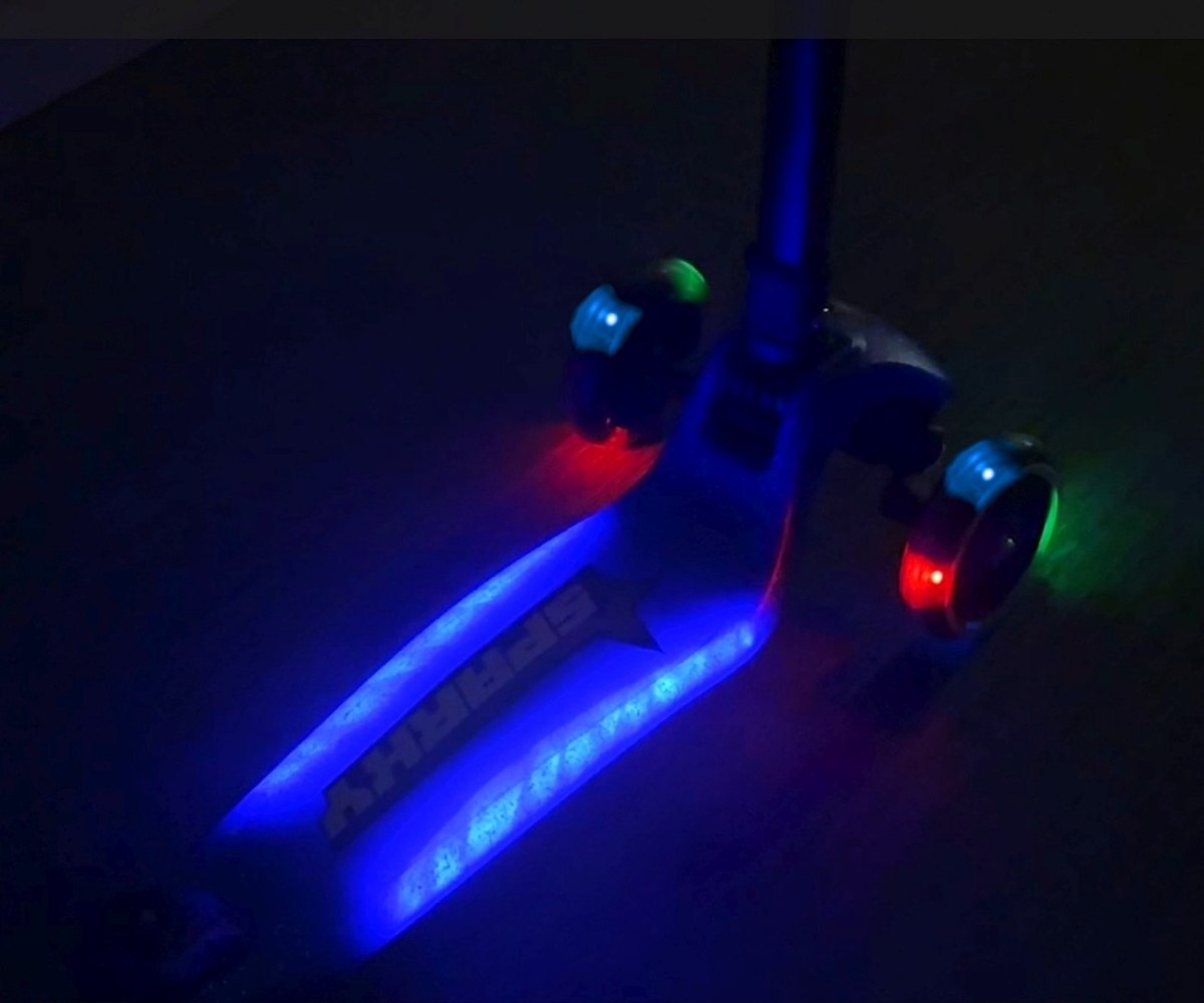SPARKY zachwyca nie tylko funkcjonalnością, ale i wyglądem! Przednie koła świecą podczas jazdy dzięki wbudowanym diodom LED, a dodatkowe podświetlenie podestu wzdłużne linie po bokach czyni każdą przejażdżkę jeszcze bardziej spektakularną/widowiskową. Efektowne brokatowe wykończenie sprawia, że hulajnoga mieni się w słońcu.