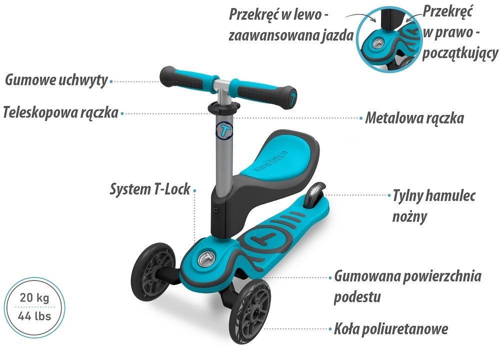 Główną zaletą hulajnogi jest opatentowany system T-Lock dla stopniowego zdobywania umiejętności.