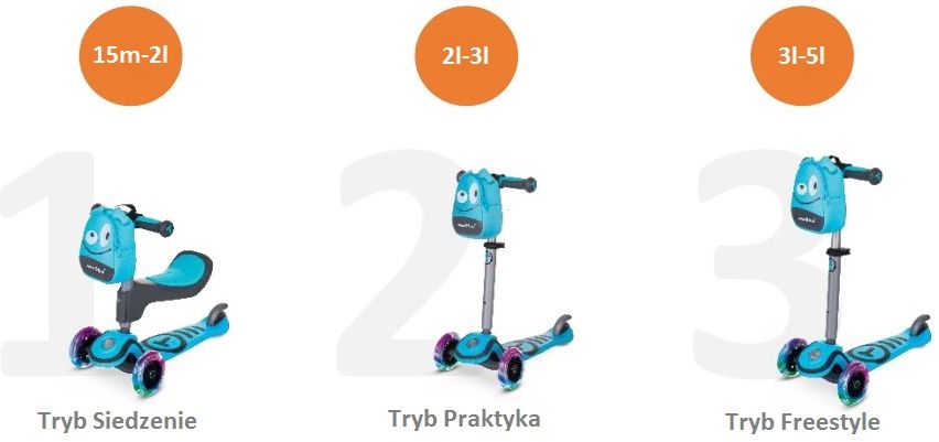 Hulajnoga posiada 3 etapy użytkowania, które pozwolą dziecku stopniowo pracować nad pewnością siebie i zdobywać umiejętności.