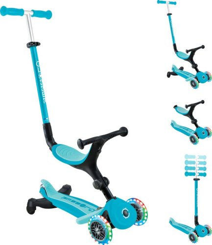 GO•UP ACTIVE LIGHTS 360° jest wyposażony w opatentowany przez Globber dodatkowy, tylny moduł kół, który umożliwia łatwe sterowanie 360° przez rodzica w trybie jazdy z prowadnikiem.