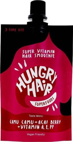 Hungry Hair Super Vitamin Hair Smoothie wspomaga skuteczne oczyszczanie i odżywianie skóry głowy oraz włosów, Hungry Hair Super Vitamin Hair Smoothie skutecznie oczyszcza i odżywia skórę głowy oraz włosy, zapewniając im zdrowy i świeży wygląd. Składniki zawarte w formule smoothie- masce zaliczane do Superfoods takie jak: ekstrakt CAMU CAMU, niezwykle bogaty w witaminę C oraz kwasy Omega, dodaje włosom witalności, wyciąg z JAGÓD ACAI wspomaga odświeżenie, a kompleks witamin A, E i PP przyczynia się do poprawy ich kondycji.