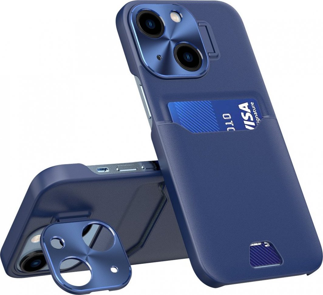 Etui iPhone 14 z serii Leather Stand Case z kieszonką na kartę i podstawką w kolorze niebieskim