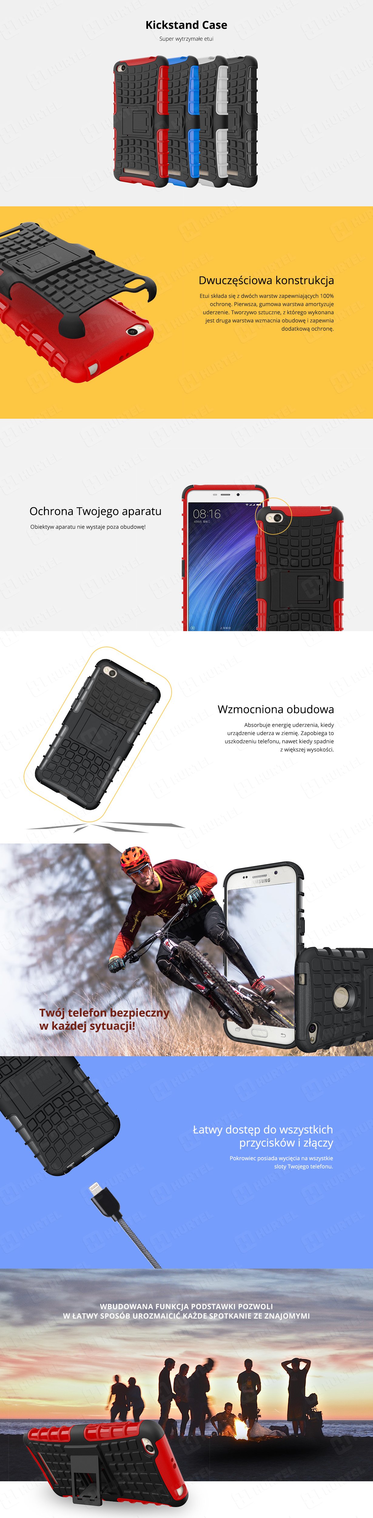 Dodatkową zaletą etui pancernego jest jego dwuczęściowa budowa. Pokrowiec składa się z plecków wykonanych z najlepszej jakości elastycznego tworzywa sztucznego oraz ze specjalnej wzmocnionej nakładki w czarnym kolorze, które dodatkowo usztywniają całą konstrukcję. Nakładka posiada również wbudowaną funkcję podstawki, dzięki czemu możesz wygodnie obejrzeć ulubiony film bez konieczności trzymania telefonu w dłoni.