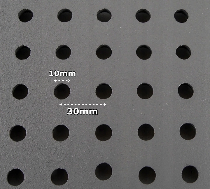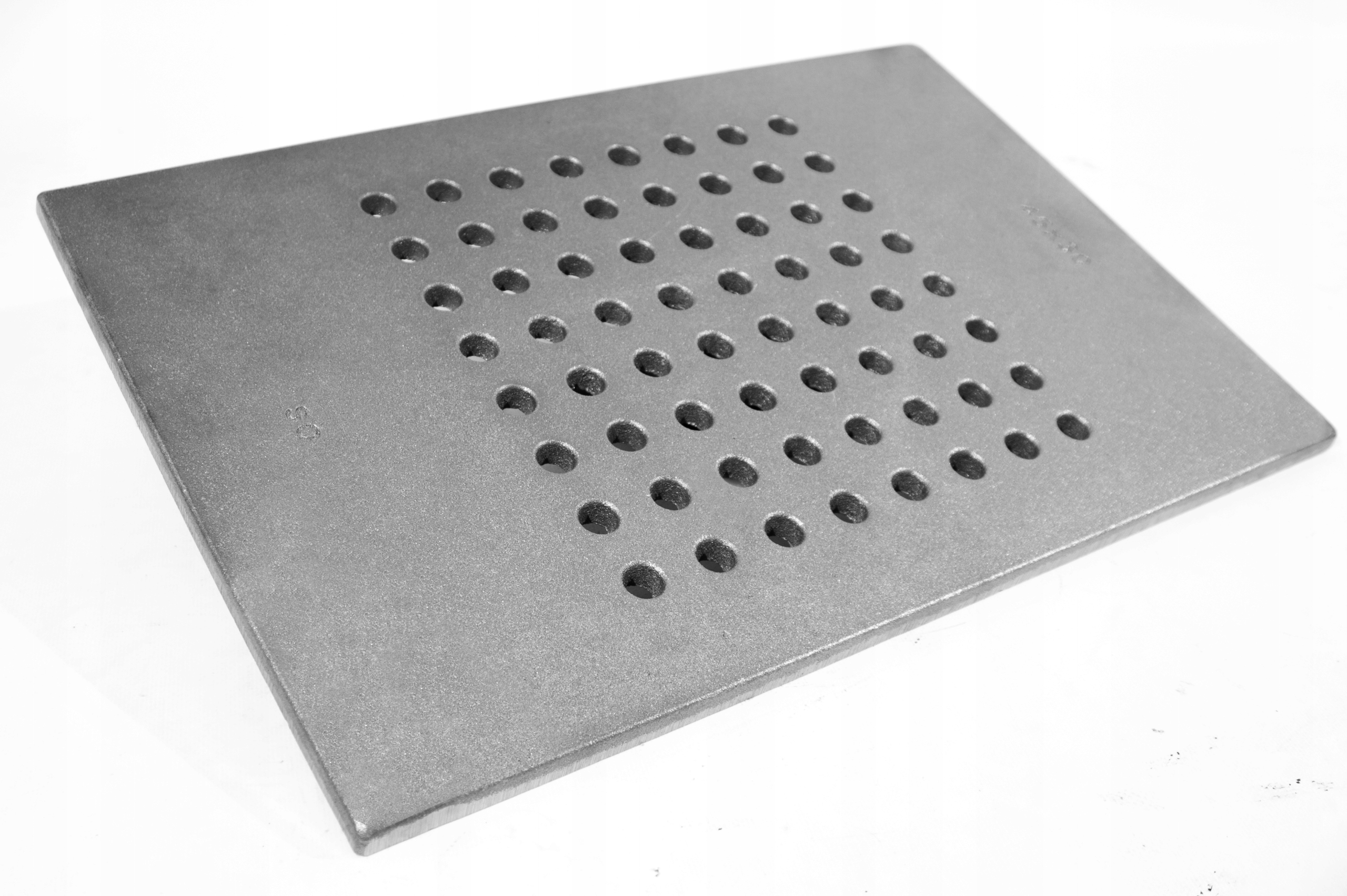 Wysokiej jakości ruszt stalowy, wykonany w Polskiej fabryce, z otworami dziurkowanymi fi 12mm. Rozmieszczenie otworów na powierzchni rusztu pozwala na sprawną cyrkulacje spalin. W zestawieniu z ich średnicą gwarantuje sprawny przesyp popiołu.