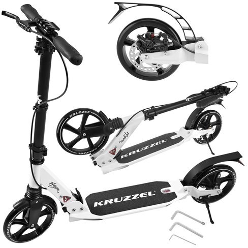 Hulajnoga Kruzzel Hyperion jest całkowicie składana, co czyni ją idealnym towarzyszem w komunikacji miejskiej. Dzięki kompaktowym wymiarom po złożeniu, można ją łatwo zabrać ze sobą wszędzie. Dodatkowo, w zestawie znajdują się narzędzia konserwacyjne oraz instrukcja obsługi w wielu językach, co ułatwia użytkowanie.