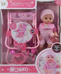 Bobasek 38cm. Dodatkowe akcesoria: metalowe siedzisko, butelka, talerzyk, widelec, łyżeczka. Produkt nie potrzebuje baterii. Zabawka przeznaczona dla dzieciu powyżej 3 roku życia.
