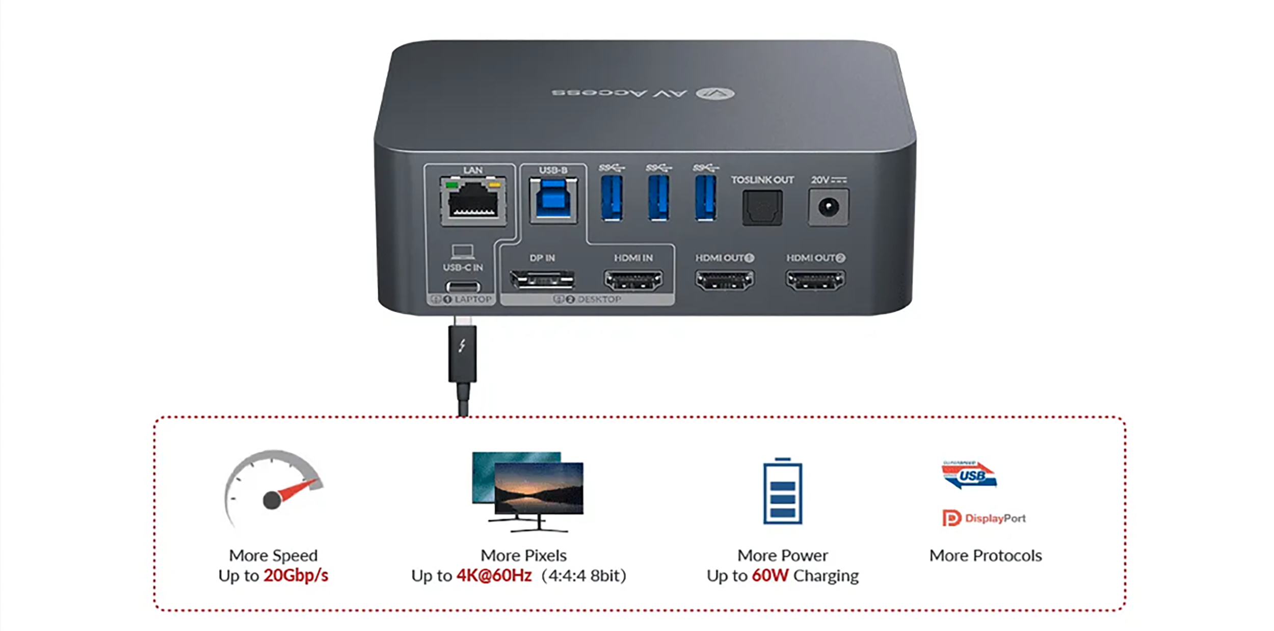 AV Access iDock C10 jest łatwy w użyciu, posiada dwukanałową konstrukcję, wiele portów peryferyjnych, w pełni funkcjonalny port wejściowy USB-C i bardzo wysokie częstotliwości odświeżania. Obejrzyjmy wideo po lewej stronie, aby dowiedzieć się, jak może to być optymalny wybór.