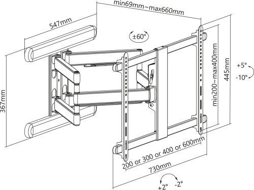 InLine® Premium oferuje szereg funkcji regulacji, które umożliwiają dostosowanie kąta nachylenia w zakresie od -10 do +5 stopni oraz obrót w zakresie -90 do +90 stopni. Dzięki tym możliwościom, łatwo ustawisz telewizor w idealnej pozycji, aby cieszyć się najlepszym widokiem z każdego miejsca w pomieszczeniu.
