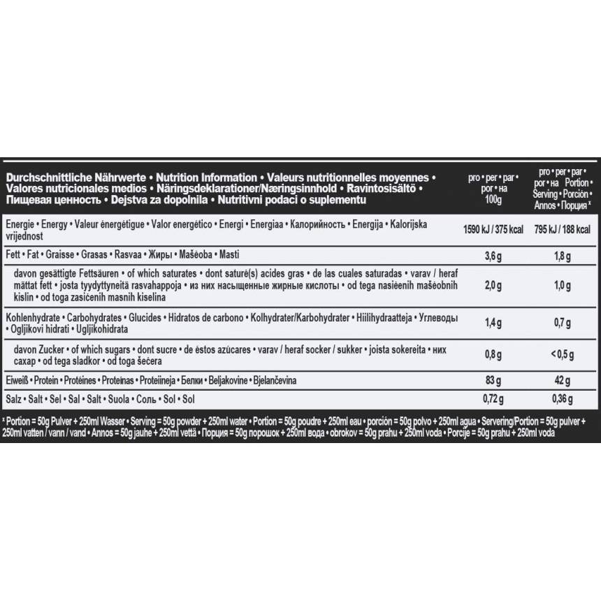 Składniki: Mieszanka białkowa (97%) (izolat białko SERWATKOWE (82%), koncentrat białko SERWATKOWE (14%), aromat, substancja zagęszczająca (guma ksantanowa), słodziki (sukraloza, glikozydy stewiolowe), substancja koloryzująca (beta karoten). Może zawierać śladowe ilości JAJEK, GLUTENU, SOI i ŁUBINU.