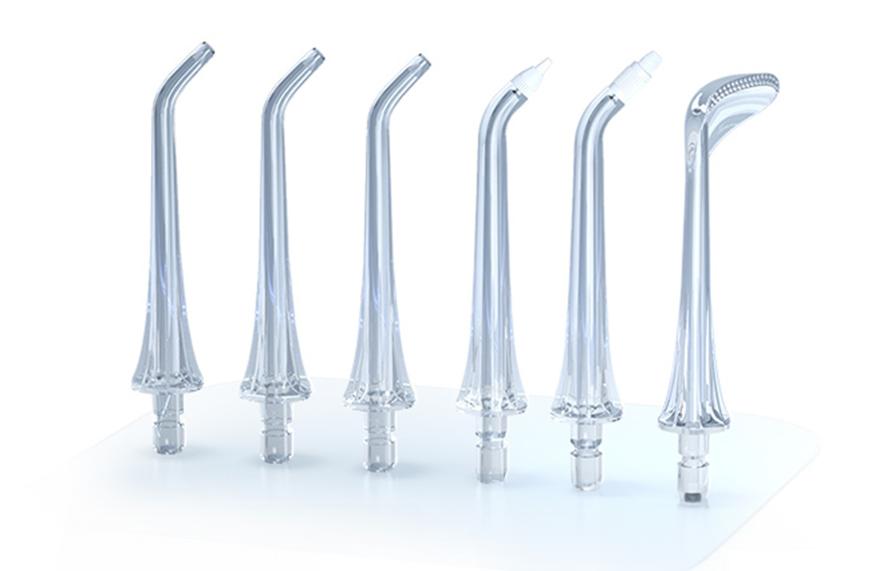 W zestawie znajduje się 6 różnych dysz, w tym 3 klasyczne, jedna do aparatów ortodontycznych, jedna do czyszczenia przyzębia i unikalna dysza do czyszczenia języka. Takie wyposażenie pozwala na kompleksową pielęgnację jamy ustnej, dostosowaną do indywidualnych potrzeb każdego użytkownika.